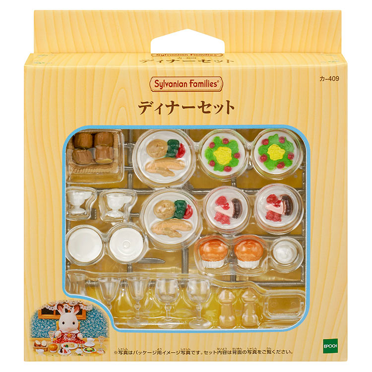 商品名カ-409 シルバニアファミリー ディナーセット サイズ130×25×124mm 品番カ-409 メーカーエポック社 商品説明おいしそうなメインディッシュに、サラダやスープ、デザートもついているセットだよ。